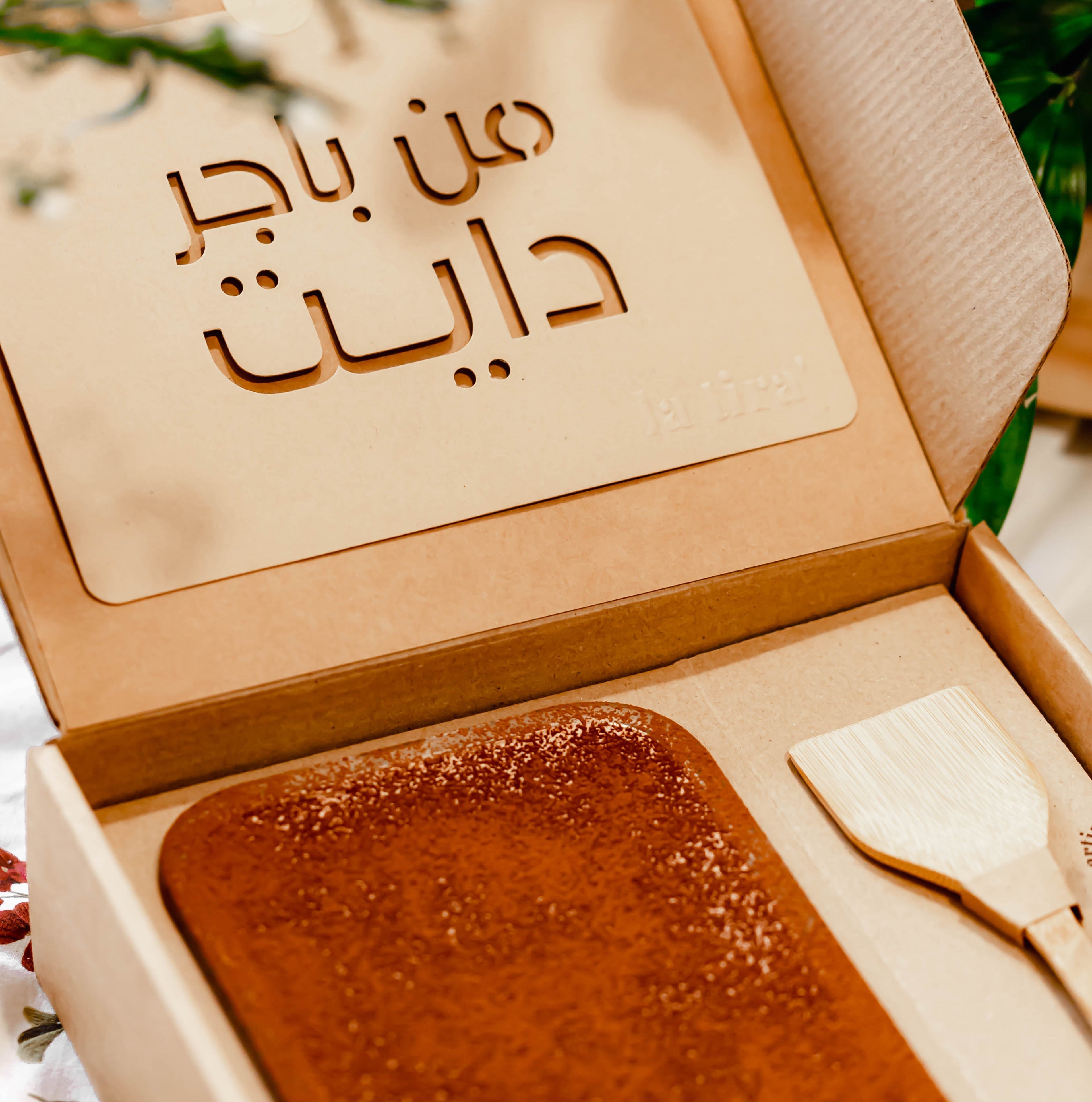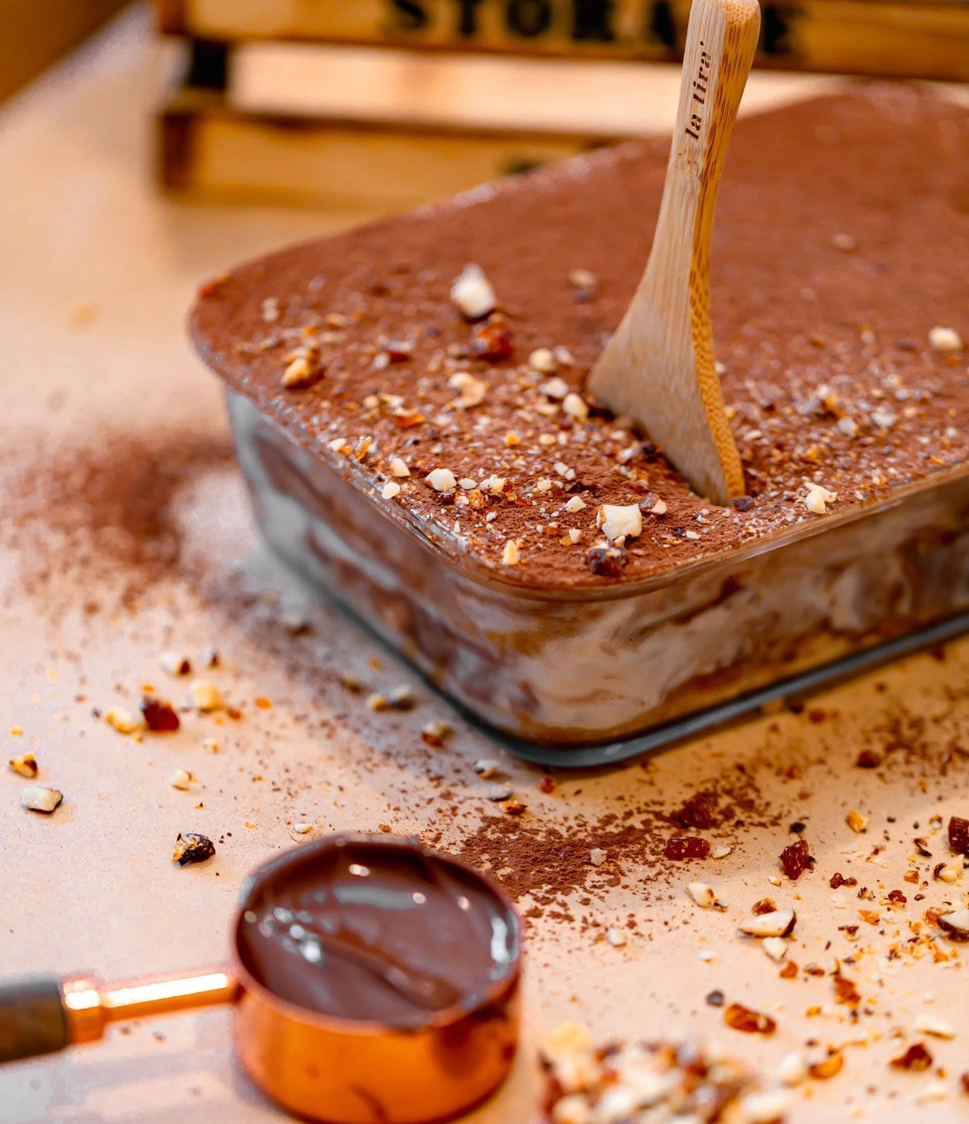 The design includes the tiramisu, the stencil, the icing sugar, and the sieve.