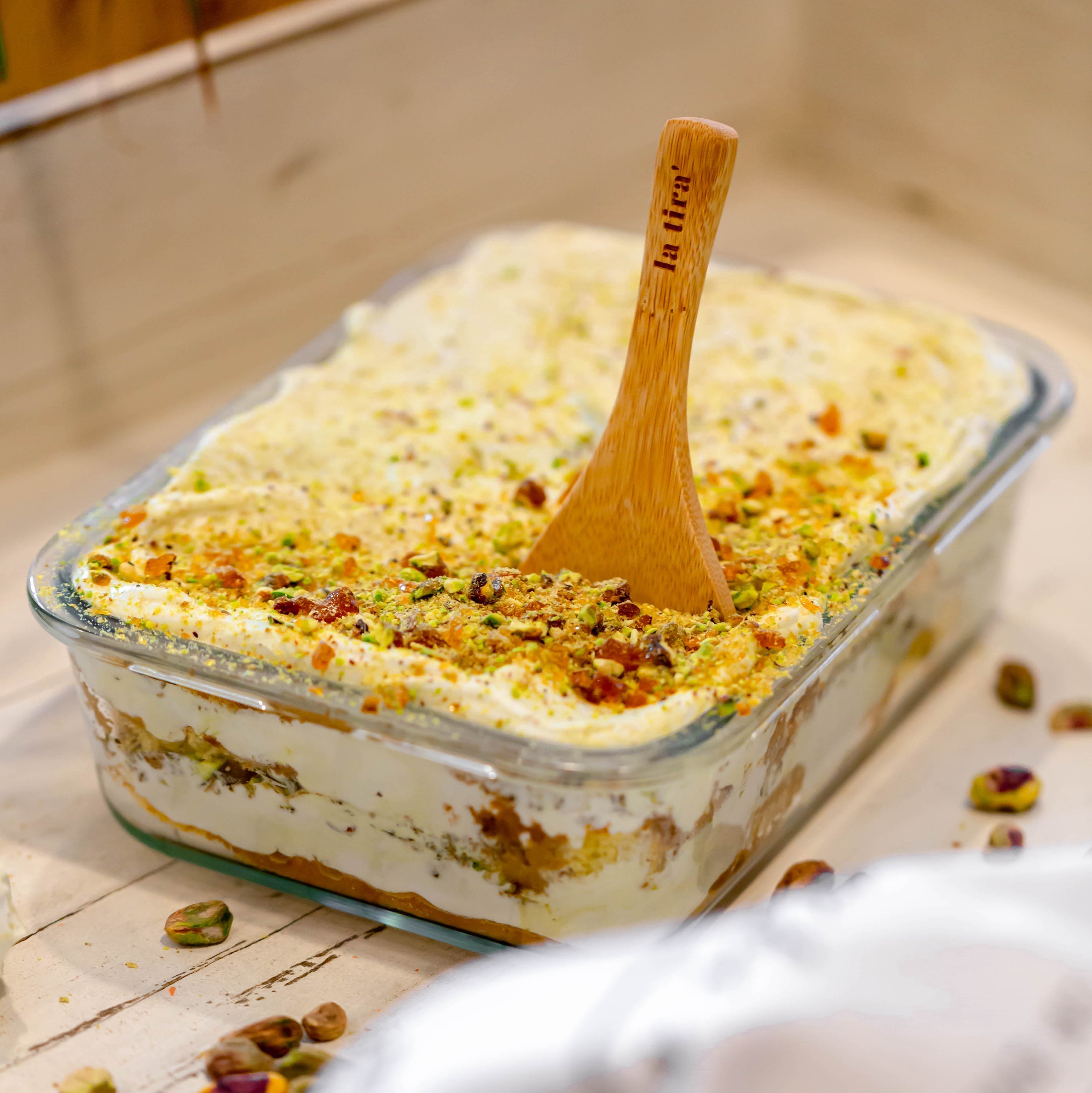 Roasted pistachio cream tiramisu cake with caramelized pistachios and homemade sponge cake.